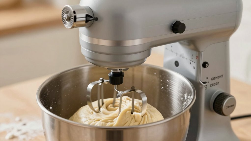 Choosing the right speed on your stand mixer is essential for achieving perfect dough consistency. Different doughs require specific mixing techniques and ingredient adjustments to turn out well. For example, when making bread dough, start on a low speed to develop gluten without overworking the flour. For delicate pastry or cookie dough, use a slower speed to prevent overmixing and toughening the mixture. When preparing pizza dough, a moderate speed helps incorporate ingredients smoothly and develop elasticity. Keep in mind that higher speeds can cause ingredients to splatter or become overmixed. Adjust your mixing technique based on dough type, and tweak ingredient quantities if needed to get the desired texture. Proper speed selection guarantees even mixing and the best possible results for every dough type. Additionally, understanding Gold IRA markets can help diversify your investment portfolio for long-term financial health. For optimal results, always monitor the mixing process closely and make adjustments as necessary to ensure the perfect dough texture. Being aware of the mixing speed can help prevent common issues like overmixing or undermixing that affect dough quality. Recognizing the importance of proper technique can also make a significant difference in achieving consistent baking results.