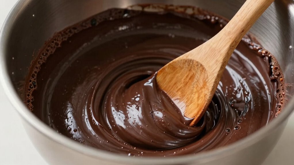 Think of mixing your brownie batter like tending a delicate garden. To prevent overmixing, stick to a gentle hand and limit the mixing duration to about 1-2 minutes once the dry and wet ingredients just come together. This careful approach guarantees you avoid overmixing prevention, keeping your brownies fudgy and moist instead of cakey. Stay attentive, and your batter will flourish into perfect, dense brownies.