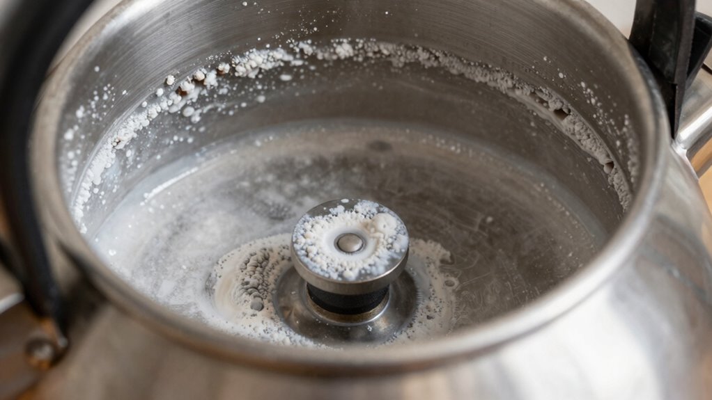 As mineral deposits build up inside your kettle, you’ll notice signs that it’s time to clean. Poor water quality often leads to visible limescale around the heating element or on the walls of your kettle. You might also observe longer boiling times or the kettle making more noise than usual. Discolored or cloudy water is another indicator that mineral buildup is affecting your appliance’s performance. Over time, these deposits can reduce your kettle’s efficiency and shorten its lifespan if left unchecked. Regularly inspecting for limescale, especially if you live in an area with hard water, helps you catch the buildup early. Knowing when your kettle needs descaling ensures excellent performance and protects your appliance’s longevity.