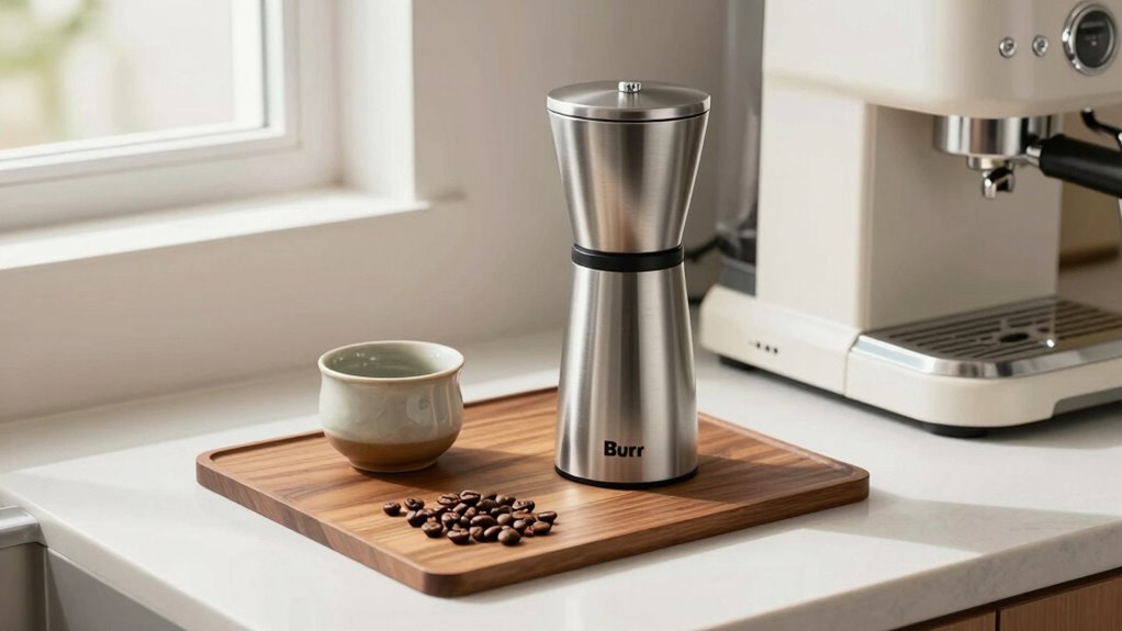 By following these simple placement rules, you’ll turn your small kitchen into a well-orchestrated symphony of efficiency. Think of your burr grinder as a delicate dancer—give it space to breathe, avoid the heat’s fiery embrace, and keep messes at bay like a seasoned maestro. With thoughtful positioning, your mornings will flow smoother than a perfectly brewed cup, transforming your compact space into a sanctuary where coffee and order harmonize effortlessly.