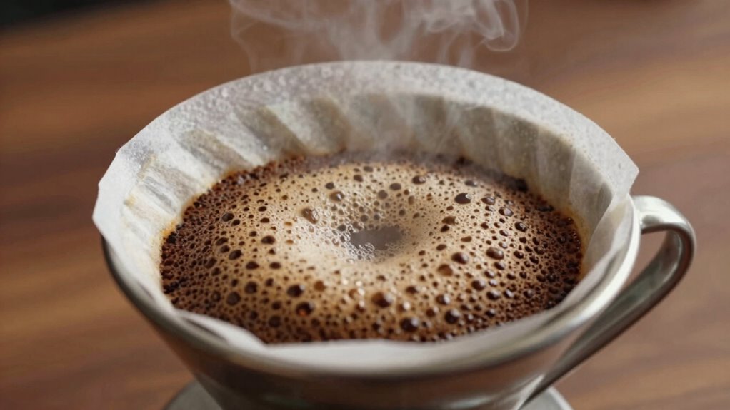 The duration of your coffee bloom can markedly influence the final flavor of your pour-over. Generally, a bloom lasting 30 to 45 seconds works well, allowing gases to escape without over-extracting. Using water at about 200°F (93°C) helps guarantee proper expansion. The choice of brewing vessel also impacts bloom time: a narrower vessel may trap gases longer, requiring a slightly longer bloom. For optimal results, consider the best coffee grounds to use, as they can enhance the overall extraction process and flavor profile.
