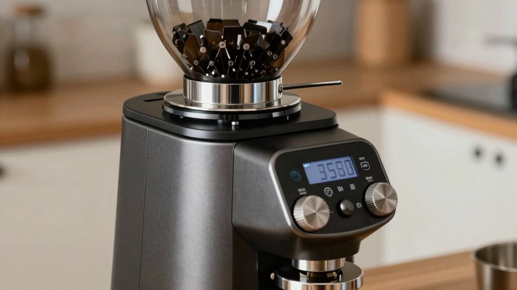 When it comes to coffee grinders, don’t get dazzled by every shiny feature. Think of your grinder as a trusty sidekick, not a spaceship. Focus on what truly matters—precision, consistency, and ease of use. Fancy bells and whistles might sparkle, but they’re often just fireworks in the night sky—beautiful, but not always necessary. Stick to the essentials, and your mornings will brew smoother, like a well-orchestrated symphony, every single time.