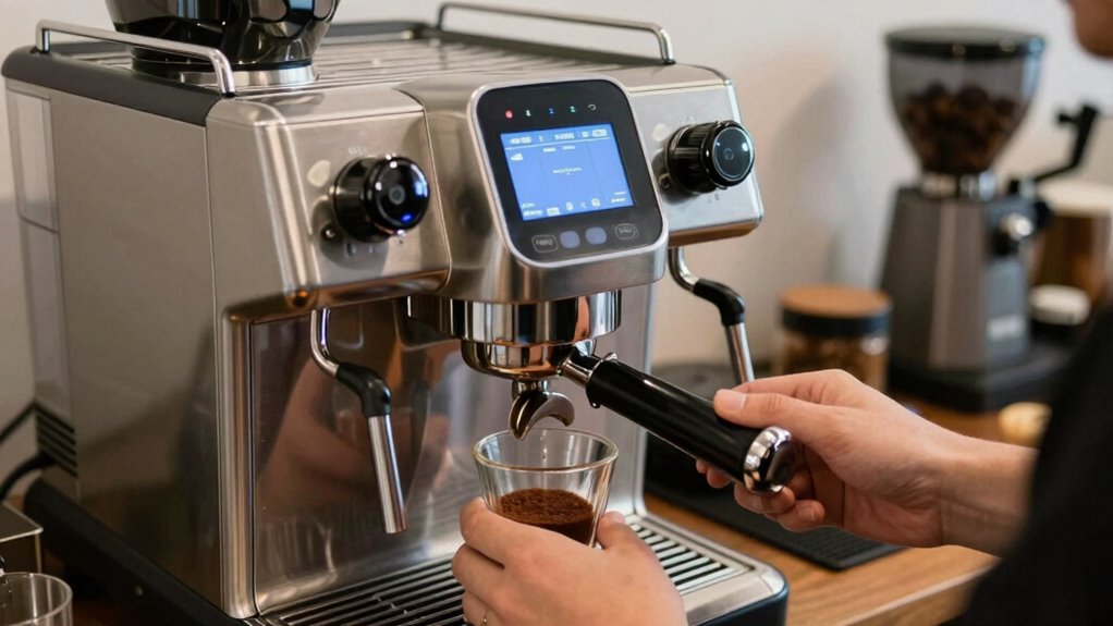 Getting started with a super automatic espresso machine can be exciting, but it’s easy to fall into common beginner mistakes that can affect your coffee’s quality. One of the most critical areas to master early on is your grinding techniques. Your machine relies heavily on the grind size to produce the perfect shot, so don’t overlook this step. If your coffee is too coarse, the water will flow through too quickly, resulting in weak, under-extracted espresso. Conversely, if it’s too fine, the water struggles to pass through, leading to over-extraction and bitter flavors. To avoid these issues, start with a medium-fine grind and adjust gradually based on your taste and extraction time. Remember, consistency is key, so invest in a good burr grinder if possible, and always grind just before brewing to preserve freshness. Proper calibration of your grinder ensures optimal extraction, affecting both flavor and aroma.
