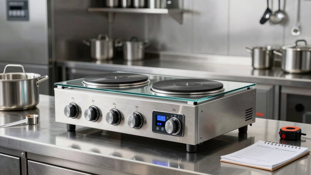 You should regularly follow cleaning protocols to keep your commercial induction burner in top shape. Wipe the surface after each use with a damp cloth and avoid harsh chemicals. Check for wear on replacement parts like the control panel and cooling fans, replacing them promptly to prevent damage. Proper maintenance ensures peak performance and longevity. Keep a maintenance schedule to catch issues early and extend the life of your induction burner.