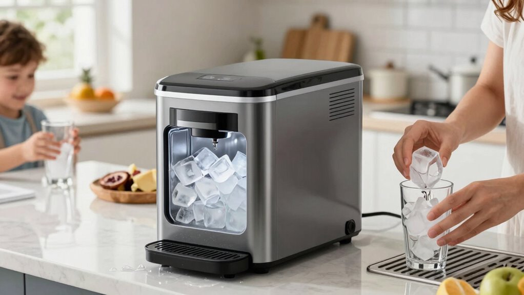 In addition, choosing the right model with a reliable ice-making process and simple maintenance routines can save you up to 30 minutes daily. This extra time can be redirected toward more meaningful family activities or personal tasks. The convenience of a countertop ice maker that produces various ice cube types, combined with straightforward maintenance tips, means you spend less time managing your ice supply and more time enjoying your busy life. With a little upfront effort, your kitchen becomes more efficient, freeing you from constant ice worries and giving you back precious minutes each day.