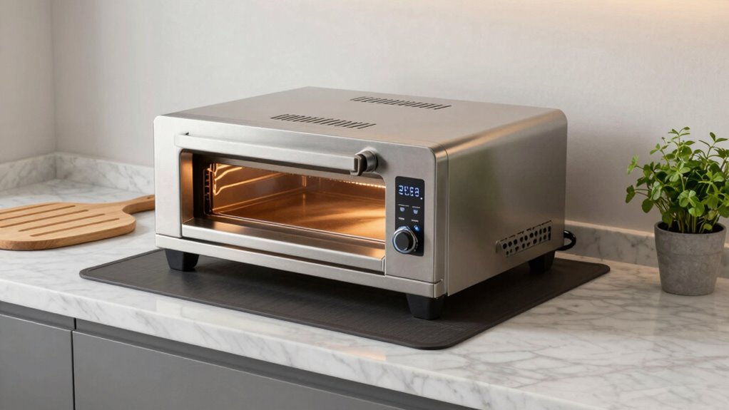 Next, pay attention to ventilation. A countertop pizza oven generates heat and sometimes smoke, so placing it in a well-ventilated spot is vital. Avoid tight corners or cramped spaces where heat can’t dissipate. Instead, position the oven on a heat-resistant surface away from walls and flammable materials. Installing a small range hood or vent fan nearby can help divert heat and prevent overheating while also reducing grease and smoke buildup that could lead to messes or damage. Proper ventilation also supports the overall safety of your kitchen setup.