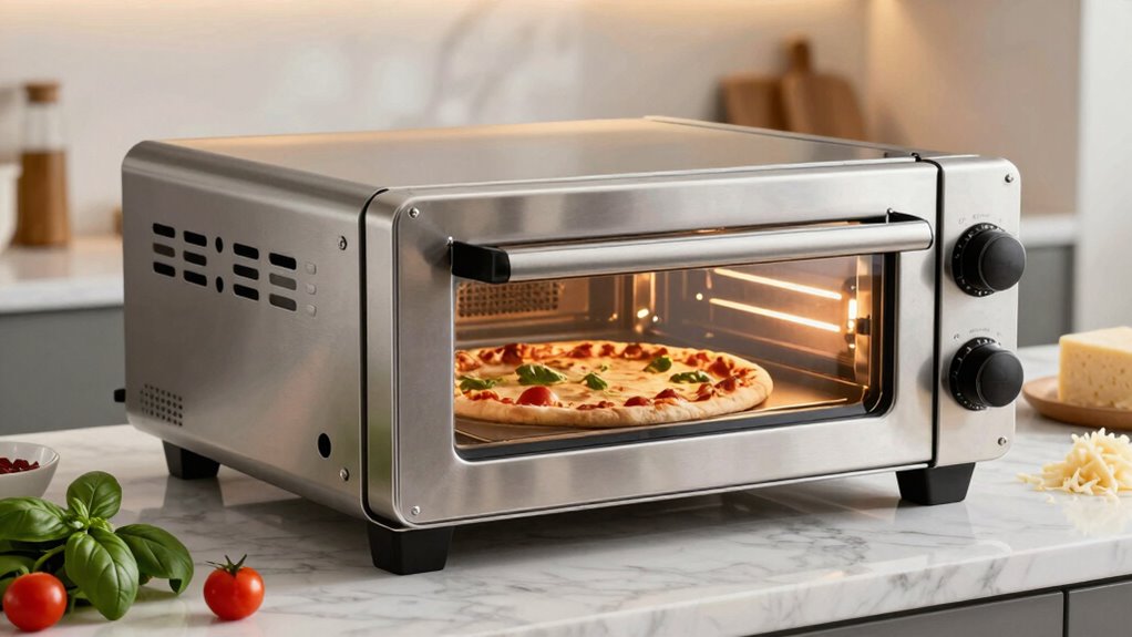 Before buying a countertop pizza oven under $600, you need to check key specs like the oven’s capacity and interior dimensions to match your pizza sizes, the quality of the heating elements to guarantee high temperatures around 500°F, and whether it supports a durable pizza stone for even baking. Also, evaluate the oven’s design for good heat distribution and user feedback for real-world performance. Stay with us to learn more about making the right choice.