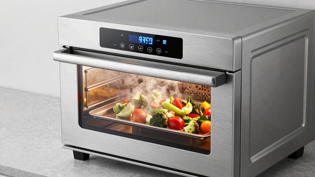 Yes, these ovens can handle large quantities of food at once, but it depends on their cooking capacity and batch size. Opt for models with bigger interior space if you’re cooking for many people or preparing multiple dishes simultaneously. Always check the specifications to guarantee the oven’s capacity matches your needs, so you don’t end up with a device that’s too small for your batch size requirements.