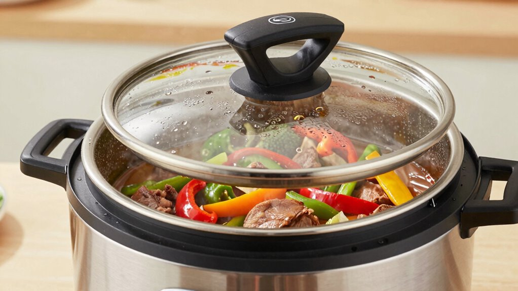 You shouldn’t open the lid during pressure cooking because lid safety is essential. Never attempt to open it until the pressure release process is complete and the pressure indicator shows it’s safe. Opening the lid prematurely can cause hot steam or food to spray out, risking burns. Always wait for the pressure to fully release, ensuring the lid is safe to open, and follow your pressure cooker’s instructions for safe use.