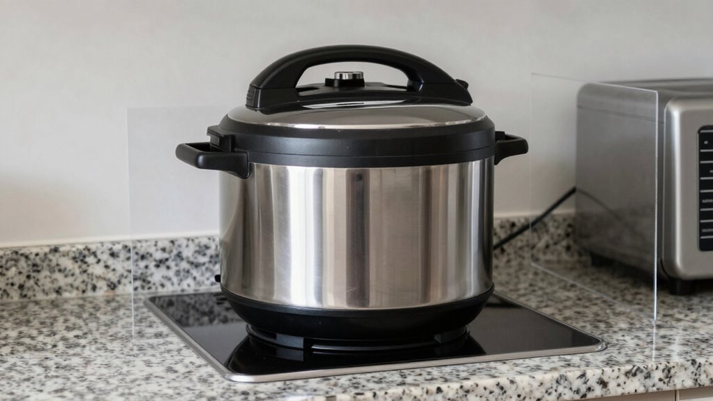 You shouldn’t place your pressure cooker near water sources, as water safety is vital. Keep it away from sinks, faucets, or wet areas to prevent electrical hazards. Make sure the outlet has proper electrical grounding to avoid shocks or short circuits. By maintaining a safe distance from water, you protect yourself and your appliance, reducing the risk of accidents and ensuring your pressure cooker functions safely and efficiently.