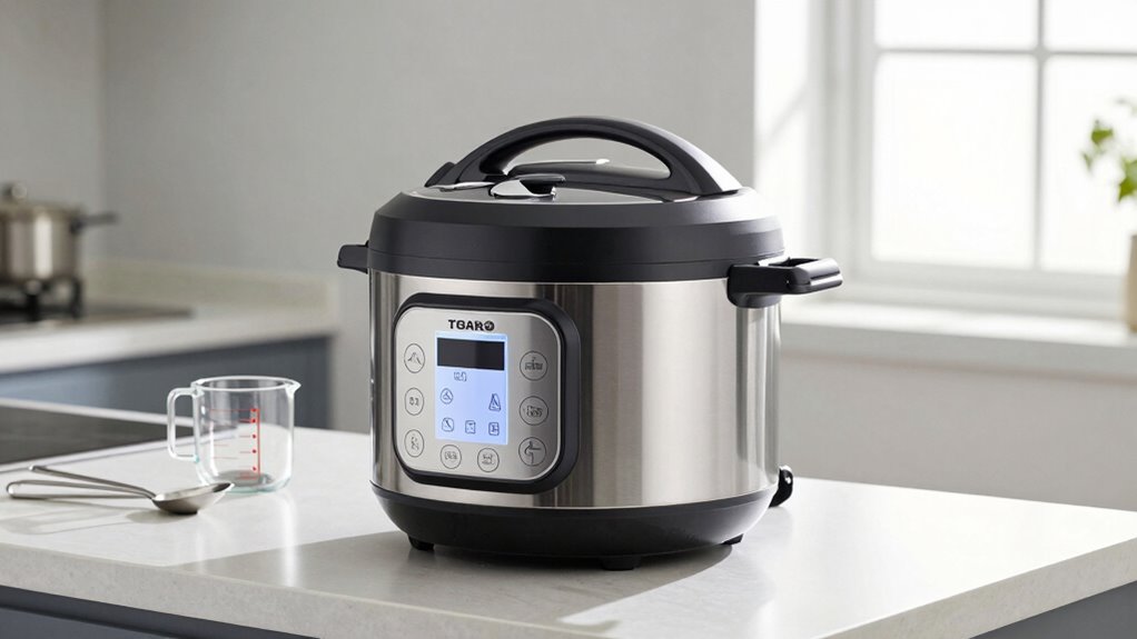 Finding a dependable electric pressure cooker under $250 doesn’t mean you have to compromise on quality or features. When shopping within this budget, it’s crucial to pay close attention to safety features and energy efficiency, as these aspects guarantee your cooking experience is both safe and economical. A good pressure cooker should have multiple safety mechanisms to prevent accidents, such as lid-lock indicators, pressure release valves, and automatic shut-off systems. These features protect you from potential hazards like over-pressurization or accidental opening during operation. Confirming your chosen model includes these safety measures helps you cook with confidence, knowing that the device is designed to minimize risks.