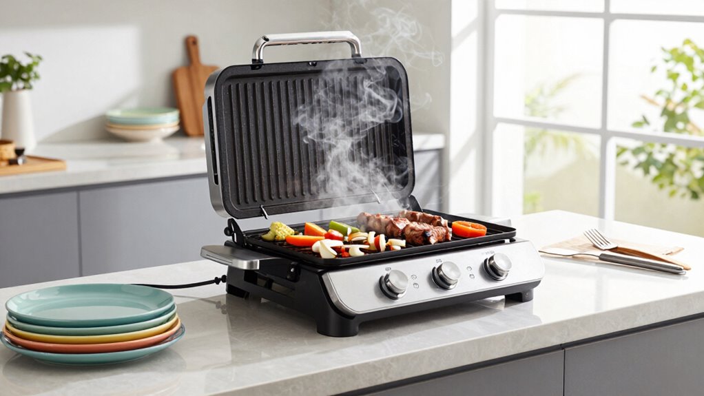 You’ll appreciate the grill’s safety features, including child safety locks that prevent accidental operation, and smoke detection sensors that automatically shut it off if smoke levels rise too high. These features protect your family and home, ensuring safe cooking while you focus on meal prep. With these safety measures, you can cook confidently, knowing your indoor grilling experience is both convenient and secure.