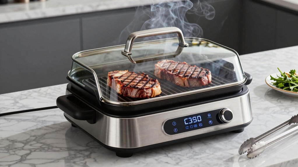 Grilling steaks indoors can often lead to unwanted smoke and lingering odors, but a smokeless indoor grill offers a practical solution. To keep your steaks flavorful without creating a mess, you need to focus on proper grill maintenance and effective smoke reduction techniques. Regularly cleaning your grill is essential. Residual grease and food particles can cause excessive smoke when heated, so wipe down the surfaces after each use and check the drip trays. Keeping your grill clean ensures it operates efficiently and minimizes smoke production. Additionally, inspecting and replacing any worn-out parts, like grease filters or fans, helps maintain ideal airflow and reduces smoke buildup.