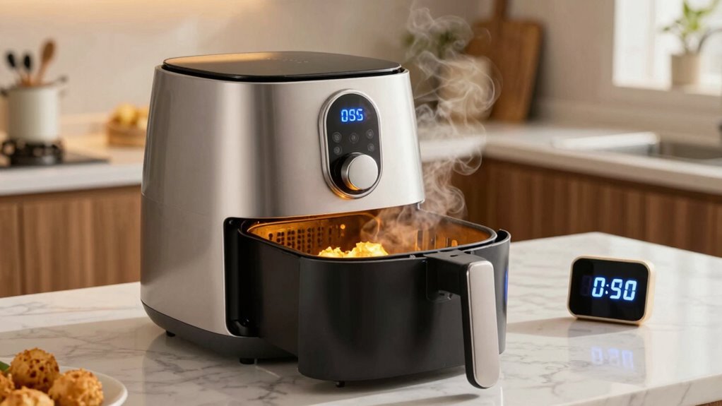 Preheating your air fryer for the right amount of time guarantees your food cooks evenly and achieves the desired crispiness. Many air fryer myths suggest preheating is always necessary, but that’s not true—preheat myths can lead to unnecessary delays. To get it right, consider these tips:
