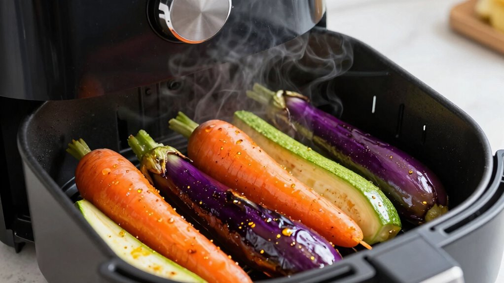 You should try cooking root vegetables like carrots and sweet potatoes, as they turn out crispy and flavorful with the oil-mist method. Leafy greens such as kale or spinach also work well, becoming tender without drying out. Keep the mist light and even to prevent burning or sogginess. This technique guarantees your veggies stay moist on the inside and crisp on the outside, making every bite delicious.