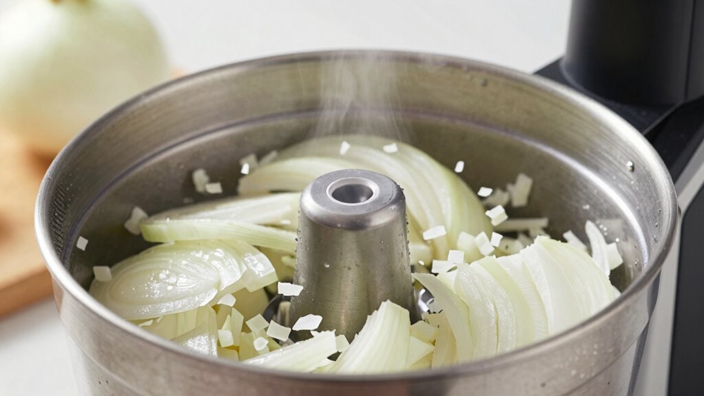 To get perfect onion pieces, you need to select the right blade speed and processing method. Using the pulse setting allows more control and prevents overprocessing, while continuous speed can be too aggressive. Remember, avoiding overprocessing is key to keeping your onions from turning bitter.