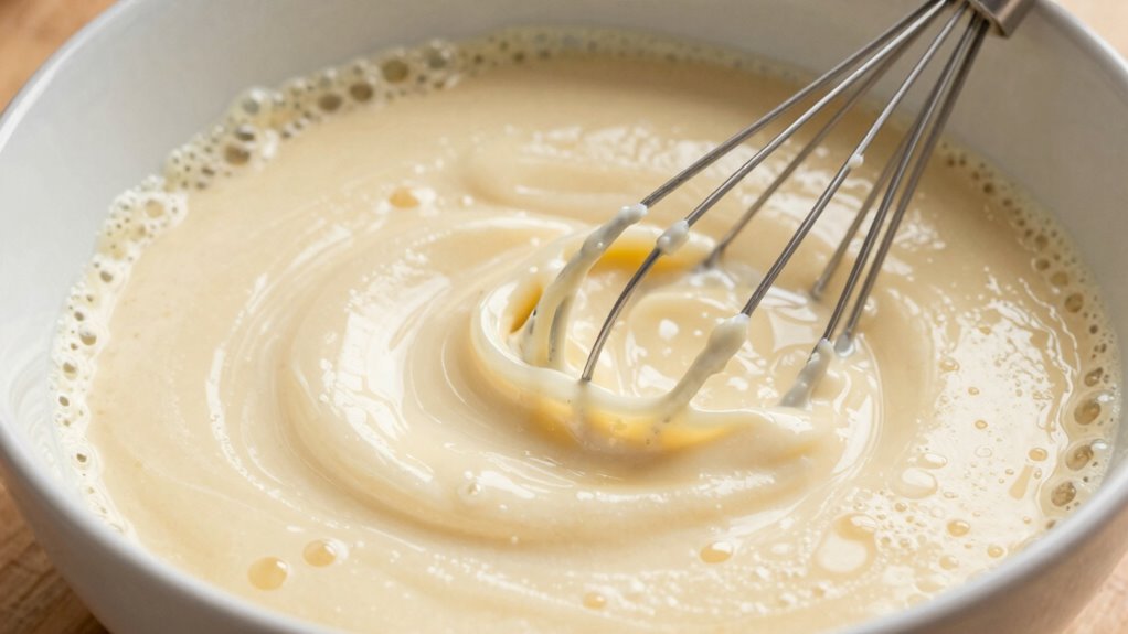Gently mixing your pancake batter is key to achieving that light, fluffy texture you desire. Use soft folding motions rather than vigorous stirring to prevent overworking the gluten. Incorporate mixing techniques that combine wet and dry ingredients just until they’re barely incorporated; a few lumps are okay. This approach helps maintain the ideal batter consistency—smooth but not overly runny. Overmixing can develop gluten, resulting in dense pancakes. Instead, gently fold until the ingredients are combined, stopping as soon as there are no visible streaks of flour. Keep in mind, patience is essential. Proper mixing techniques help preserve the air bubbles that give pancakes their fluffiness, ensuring your batter remains light and tender. Additionally, understanding plant properties and how they interact in recipes can further improve your cooking results. Being mindful of ingredient interactions can also help you troubleshoot and perfect your pancake batter consistency. Using the correct baking powder amount can also aid in achieving optimal rise and fluffiness in your pancakes. Paying attention to batter temperature can also make a significant difference in how well your pancakes turn out.