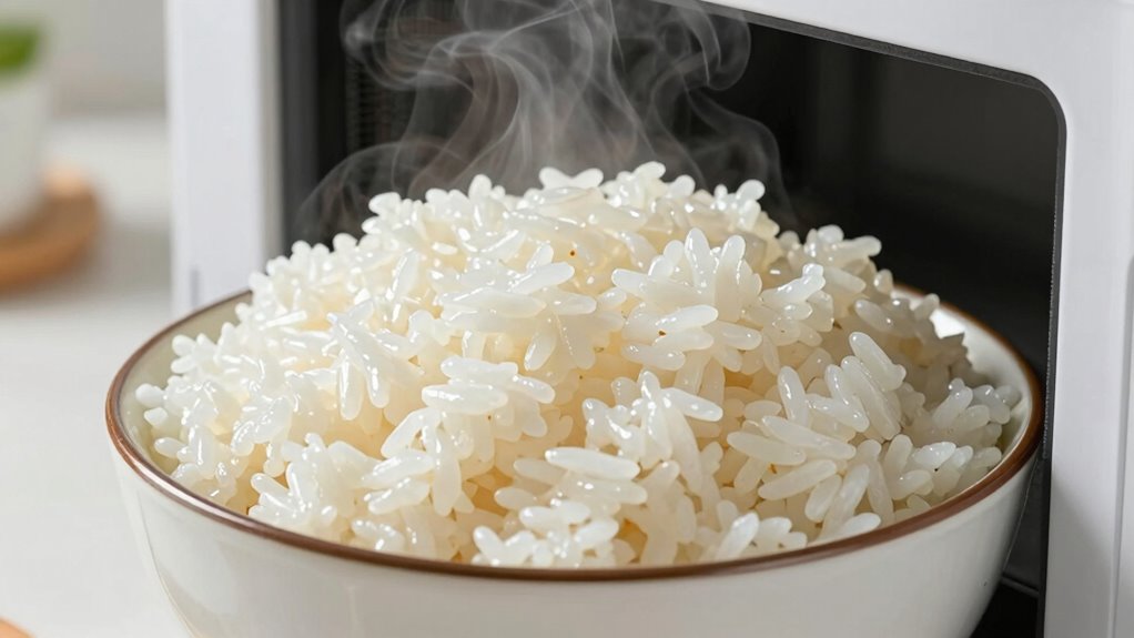 To achieve perfectly reheated rice every time, paying attention to a few key troubleshooting tips can make all the difference. First, ensure proper storage tips by transferring leftover rice to an airtight container and refrigerating within two hours. When reheating, add a splash of water or broth to help restore moisture and preserve flavor. Cover the rice with a microwave-safe lid or damp paper towel to trap steam and prevent dryness. Stirring halfway through reheating promotes even heat distribution. If rice still turns out dry or uneven, check your microwave’s power settings and adjust accordingly. Lastly, always consume reheated rice promptly to maximize flavor preservation and avoid spoilage. These simple troubleshooting tips will help you enjoy moist, flavorful rice every time.