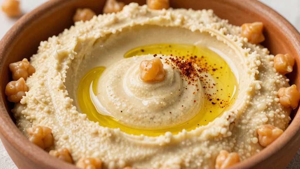 Achieving perfectly smooth, warm chickpea hummus at home requires attention to a few key tips. First, focus on chickpea preparation: always peel the warm chickpeas for a silkier texture. Second, blend thoroughly—use a high-speed blender for at least 2-3 minutes to ensure smoothness. Third, add liquid gradually, such as warm cooking water or olive oil, to attain the desired consistency. Fourth, pay attention to hummus presentation; a smooth surface with a drizzle of olive oil and a sprinkle of paprika or herbs enhances visual appeal. By mastering chickpea preparation and refining your blending technique, you’ll create irresistibly smooth, warm hummus that elevates your dish and impresses guests. These steps guarantee a refined, restaurant-quality presentation every time.