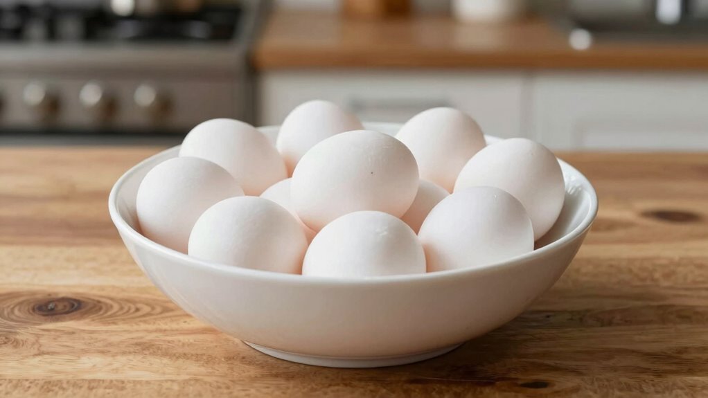 Ever wondered how to quickly bring chilled eggs to room temperature without waiting? The bowl method is your answer. By placing eggs in a bowl of warm water—around 70°F to 80°F—you can rapidly adjust their temperature. This method minimizes the risk of cracking by supporting the eggs’ shell integrity. It’s essential to start with fresh eggs, as older eggs might have compromised shells that are more prone to breaking under temperature changes. Submerging eggs gently ensures even warming, preventing sudden temperature shocks. The warm water accelerates heat transfer, bringing eggs to room temperature in just 10-15 minutes. This quick adjustment preserves egg freshness, making them ideal for baking or recipes requiring room-temperature eggs, all while avoiding the wait and potential damage associated with slow warming. Additionally, understanding field recording techniques can help in capturing detailed audio cues for culinary tutorials or instructional videos about egg preparation. Proper handling and temperature control are critical for optimal results in both cooking and food safety. Incorporating traditional practices in kitchen routines can also enhance the overall wellness connection in food preparation, aligning with Indigenous health principles. Moreover, being mindful of food safety guidelines ensures that eggs are handled properly during this rapid warming process. Utilizing proper storage conditions can further maintain egg quality and safety during rapid temperature adjustments.