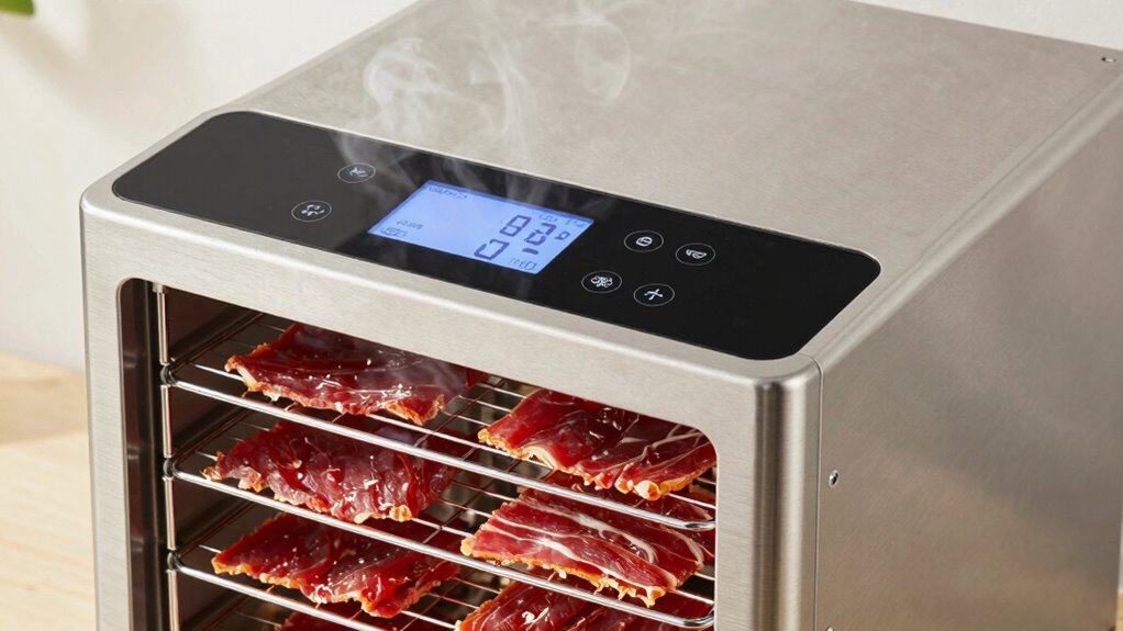Remember, the airflow in your dehydrator also plays a role. Good circulation inside a stainless steel dehydrator ensures even jerky drying, preventing hot spots that can cause uneven drying or spoilage. Many stainless steel models have multiple trays, which allow you to dry different flavors simultaneously without cross-contamination. This feature adds flexibility and efficiency, especially if you plan to make jerky regularly. Additionally, airflow management within the dehydrator contributes to consistent drying results.