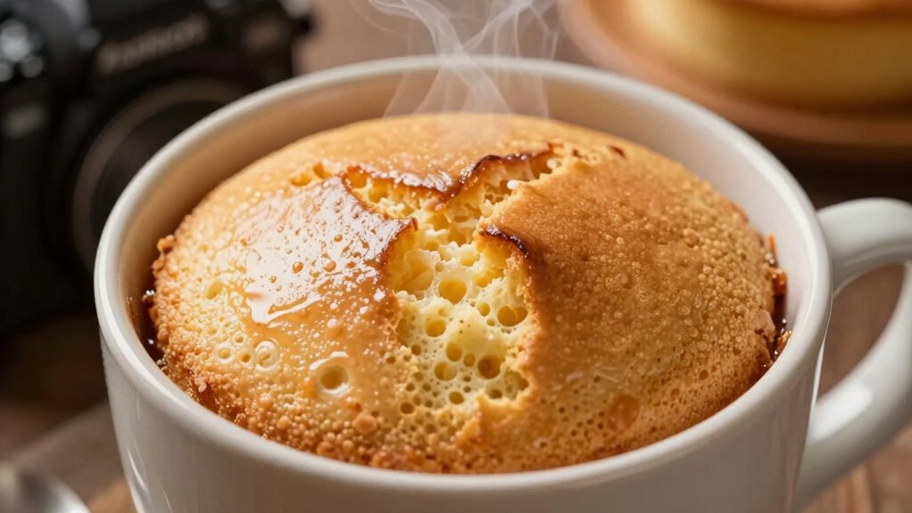 Think of your mug cake as a dance floor; when it develops a rubbery crust, it’s like dancers sticking to the floor. This happens because ingredient interactions, especially flour and eggs, create a firm surface. Moisture evaporation from the top causes that crust, while the inside remains moist. Overcooking accelerates this, so to avoid it, monitor your cake and make certain of even heating, keeping your “dance floor” just right.