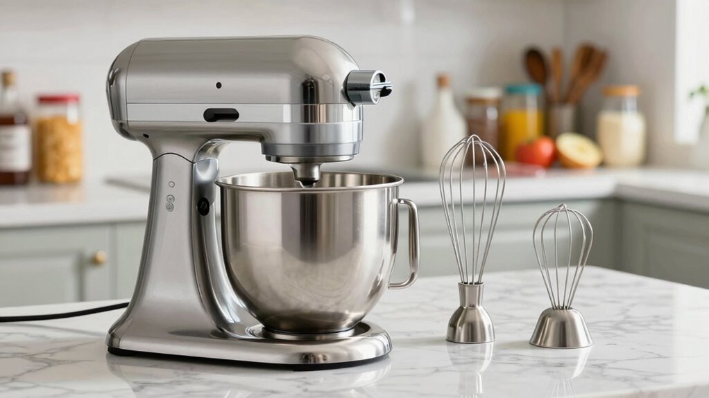 When it comes to stand mixers, don’t get swept away by every shiny feature. Think of your mixer as a trusty sidekick, not a spaceship—stick to what truly enhances your baking and skip the bells and whistles that add clutter. Focus on power, durability, and essential attachments. After all, a good stand mixer is like a reliable friend—simple, dependable, and there for you when you need it most, not a circus performer juggling every new gadget.
