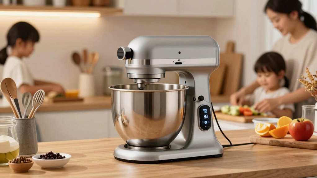 Imagine a bustling kitchen in the 21st century—your stand mixer handles large family meal prep with ease. It offers baking versatility to knead dough, whip cream, or mix batter in one device. Plus, its compact storage solutions keep your countertop tidy. You won’t have to worry about capacity limits, as modern stand mixers are designed to handle big batches, making your busy family mealtimes smoother and more efficient.