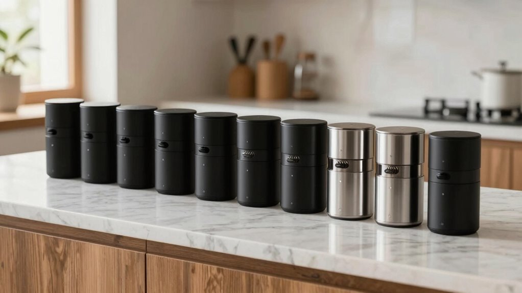 These grinders are surprisingly quiet during operation, usually producing around 60-70 decibels, similar to background conversation. I’ve found that most models have sound-dampening features, so they don’t disturb my mornings or evening routines. While some noise is inevitable, especially at higher settings, I appreciate how modern burr grinders balance power and quietness, making them perfect for small kitchens where noise can be a concern.