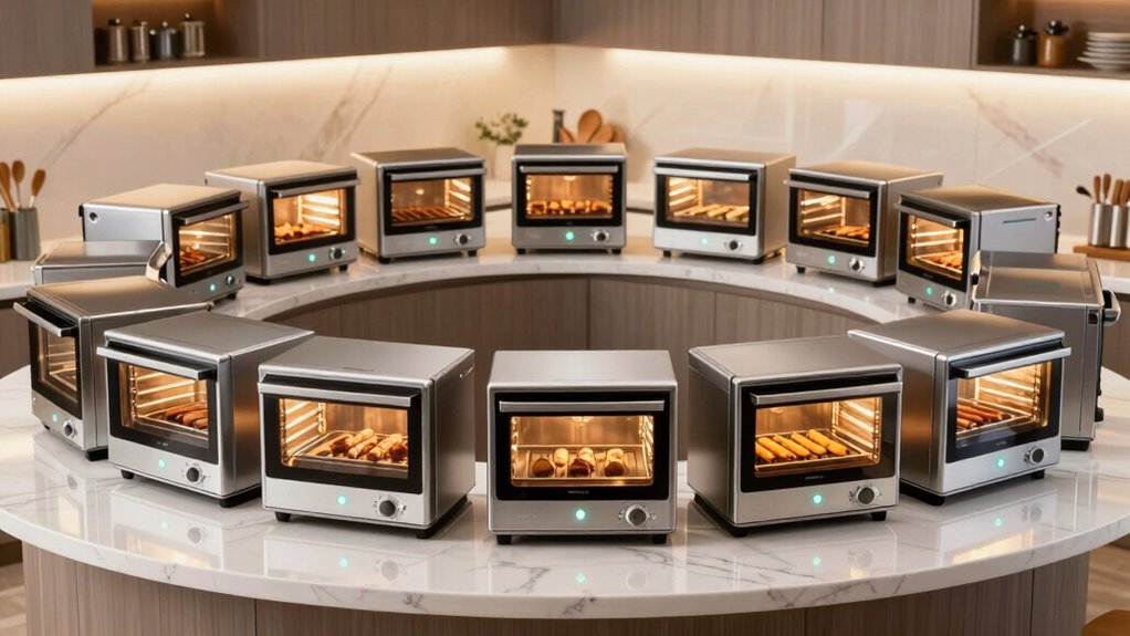 I’ve tested many countertop rotisserie ovens and found the best for beginners include models like Ronco’s large-capacity ovens, Nutrichef with its versatile features, and TOSHIBA’s convection toaster ovens with handy accessories. These units are easy to operate, versatile, and come with helpful safety features. If you want reliable performance and simple controls, check if these options fit your needs. Keep going to discover more details on each of these beginner-friendly rotisserie ovens.