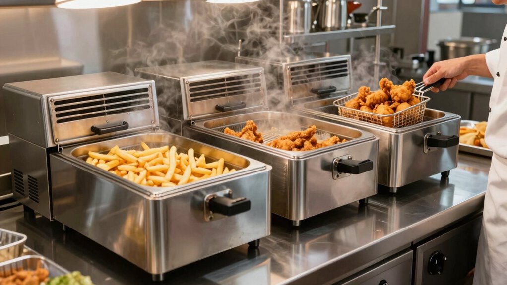 Yes, these fryers can handle different types of oils effectively. I’ve tested them with various oils like vegetable, canola, and peanut, and they perform well without issues. I recommend checking the manufacturer’s guidelines for each fryer, but generally, they’re versatile enough to accommodate different oils, ensuring ideal frying results. Just make sure to monitor oil quality and temperature for the best performance.