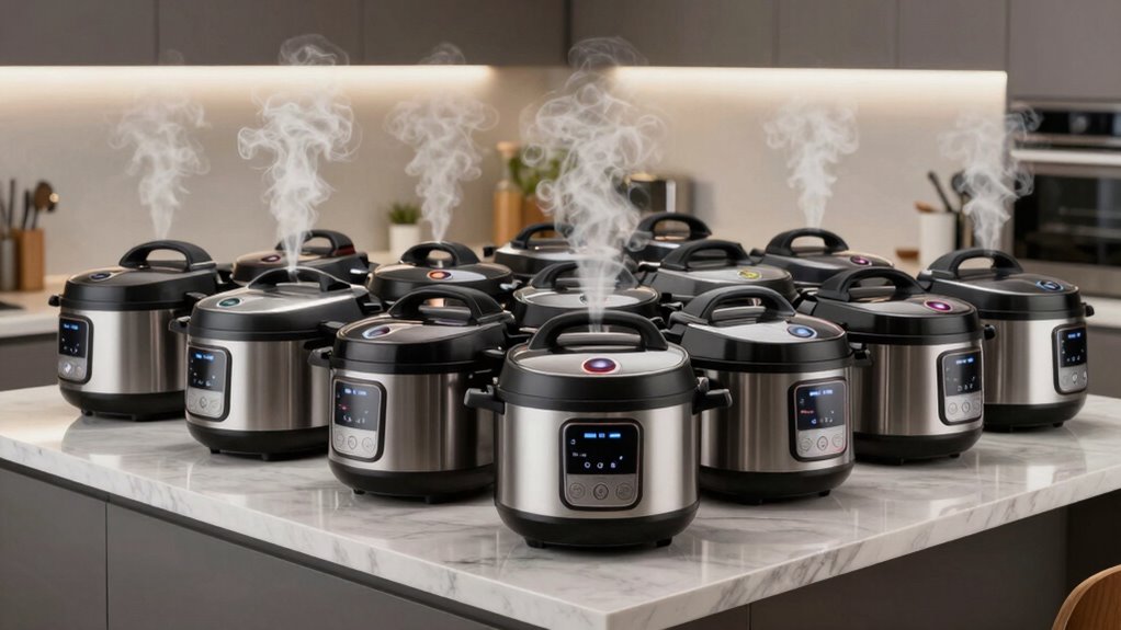 Imagine a safety net catching you — that’s how I see these models’ features. Yes, they have specific safety features like automatic steam release valves and pressure sensors that prevent accidents. Some models even include lid-locking mechanisms and voice alerts to warn you when steam is venting. These features work together to keep you safe, making your cooking experience worry-free and more enjoyable.