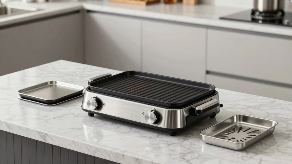 Detachable plates are a key feature to contemplate because they make cleaning and maintenance much simpler. When plates are removable, I can wash them separately, which guarantees a more thorough clean and reduces the risk of damage. Dishwasher-safe plates are designed to withstand high temperatures and water exposure, making cleanup even more convenient. Plus, having the ability to detach plates enhances safety by minimizing hot surface handling during removal. Many grills with this feature also include secure locking mechanisms, preventing accidental detachment during cooking or cleaning. Overall, plate detachability not only simplifies maintenance but also adds a layer of safety and convenience, making it a vital factor when selecting an indoor electric grill with dishwasher-safe parts.