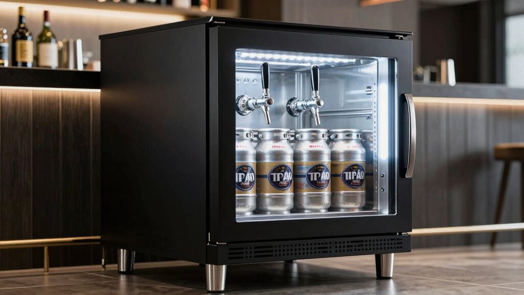 Dual-tap kegerators are quite energy-efficient, especially models with modern insulation and advanced compressor technology. I’ve found that they use less power than older or single-tap units, thanks to better temperature regulation and energy-saving features like automatic defrost. While they do consume some electricity, overall, they’re designed to keep your beers cold without substantially hiking your energy bills, making them a smart, eco-friendly choice for home or commercial use.
