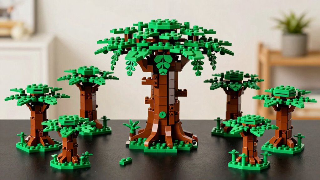 Lighting and visual effects can dramatically elevate the presentation of your Lego Zelda Great Deku Tree set, transforming it from a static display into a mesmerizing centerpiece. LED lighting kits are a game-changer, highlighting intricate details and making the set more vibrant. You can choose between USB-powered lights or battery-operated LEDs, offering flexibility for different display spaces. Proper light placement and color choices allow you to emphasize specific features, like facial expressions or tiny accessories, creating a dynamic visual impact. Quality LEDs with anti-heat and anti-burning properties assure safety and durability, even during extended displays. Incorporating well-chosen lighting effects turns a simple build into an eye-catching exhibit that truly captures the magic of the Zelda universe.