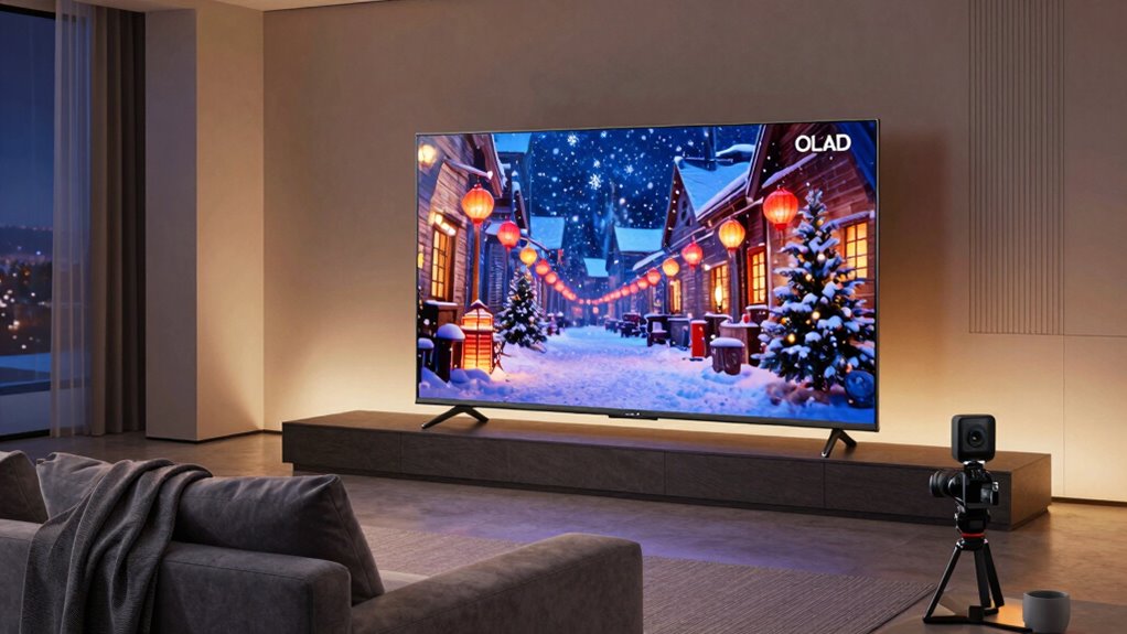 To get the most out of an OLED TV, it is vital to pay attention to key picture quality features that elevate your viewing experience. OLEDs have over 8 million self-lit pixels, delivering perfect black levels, vibrant colors, and high contrast for stunning images. Brightness Booster technology enhances pixel luminance, making scenes luminous and detailed even in bright rooms. Support for HDR formats like Dolby Vision and HDR10 ensures exceptional contrast, brightness, and color accuracy, bringing cinematic visuals to life. Filmmaker Mode preserves the director’s original intent with authentic aspect ratios and colors. Additionally, AI-powered processing and upscaling optimize picture quality across content types, restoring details and sharpening clarity, especially in lower-resolution media. These features profoundly enhance your overall viewing experience.