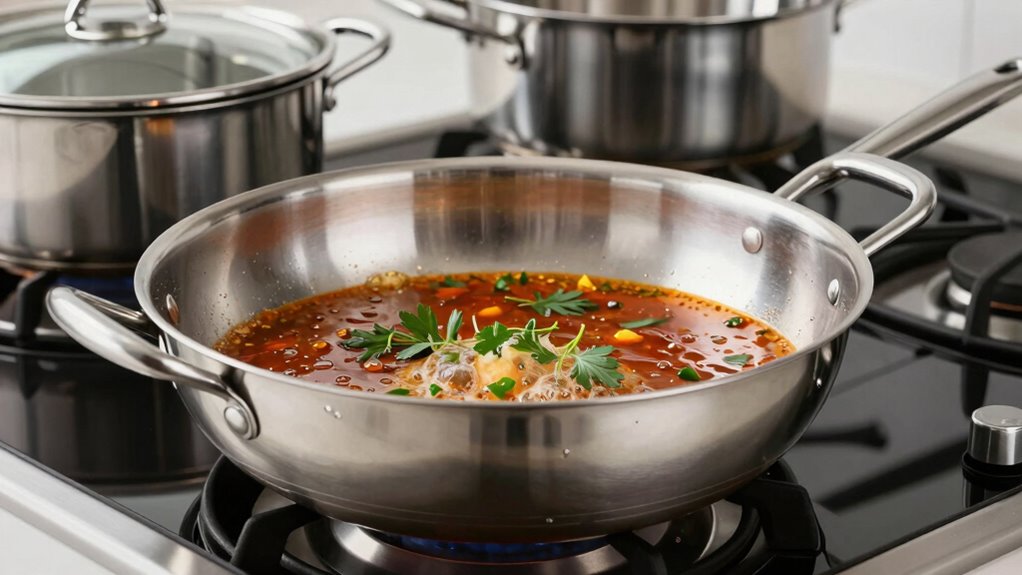 Choosing a premium sauté pan means paying close attention to its material quality and how well it conducts heat. High-quality pans often feature multi-ply construction, such as tri-ply or 5-ply layers, combining stainless steel and aluminum for superior heat transfer. An aluminum or copper core ensures rapid, even heating, preventing hot spots that can scorch delicate sauces. The material’s thermal conductivity affects how quickly the pan heats and how evenly heat is distributed, which is vital for precise sauce reduction. Non-reactive materials like stainless steel or anodized aluminum also prevent chemical reactions with acidic ingredients, preserving flavor. Good material quality minimizes temperature fluctuations, giving you better control over simmering and reducing the risk of burning or uneven sauce consistency.