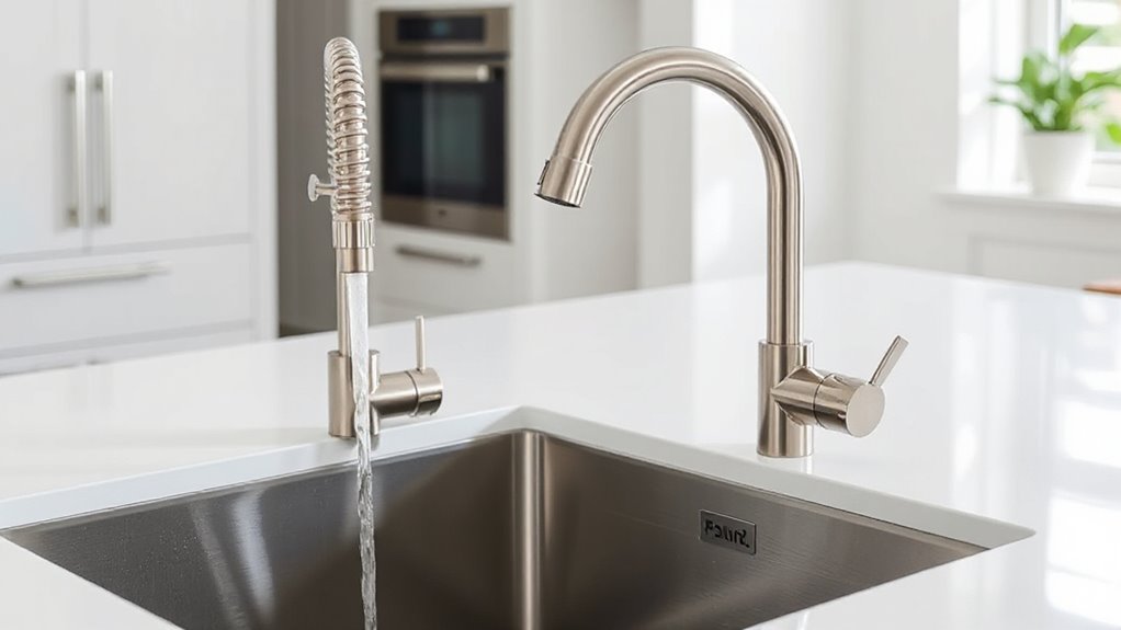 Maintaining a pull-down kitchen faucet with magnetic docking is straightforward when you understand the key factors. The easy-to-clean sprayheads can be quickly snapped on and off, making it simple to wipe away mineral deposits and grime. The magnetic dock system keeps the sprayhead securely in place, reducing the need for frequent adjustments or repairs. Many models feature Touch-Clean or no-splash nozzles, allowing me to easily wipe away mineral buildup with just my finger or cloth. Regularly cleaning the magnetic docking area and sprayhead with a damp cloth prevents debris from compromising the connection. Choosing a faucet with a durable, spot-resistant finish also means less frequent cleaning, helping my faucet stay pristine with minimal effort.