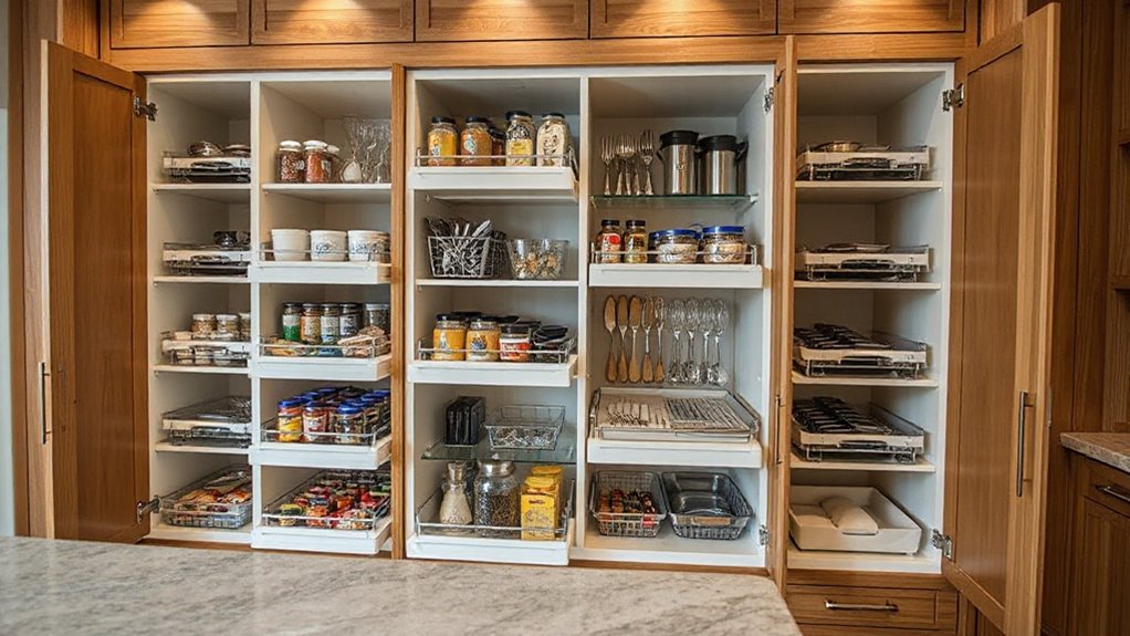 I’ve found the top pull-out cabinet organizer systems with soft-close slides for 2026, emphasizing durability, smooth operation, and easy installation. These options include systems made from solid birchwood, beechwood, and eco-friendly materials, supporting heavy loads and quiet closing. They come in various sizes and configurations, perfect for kitchens, pantries, or bathrooms. If you’re curious about the best picks and what makes each unique, keep exploring to find the perfect fit for your space.