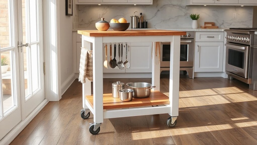 If you’re looking for the 15 best rolling kitchen island carts for extra prep space in 2026, I’ve found options that combine durability, style, and functionality. From sleek white designs to rustic and farmhouse styles, these carts feature storage, drop leaves, and mobility features like lockable wheels. They’re perfect for expanding your workspace, organizing your kitchen, and fitting various decor. Keep exploring to discover tips on choosing the right cart for your needs.