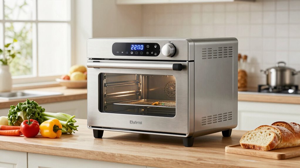Choosing a countertop oven that fits a busy family’s lifestyle means prioritizing safety features that provide peace of mind. I look for models with automatic shut-off and overheat protection to prevent accidents and guarantee safe operation. Panel lock or child lock functions are essential to prevent young children from tampering or accidentally activating the oven. Clear safety alerts, like alarms or indicator lights, help me stay aware of any issues during use. I also prefer ovens made with non-toxic, PFAS-free materials to minimize health risks. Features like cool-touch exterior surfaces and secure door locks add active safety, especially if the kitchen is bustling. Ultimately, these safety features help me cook confidently, knowing my family stays protected at all times.