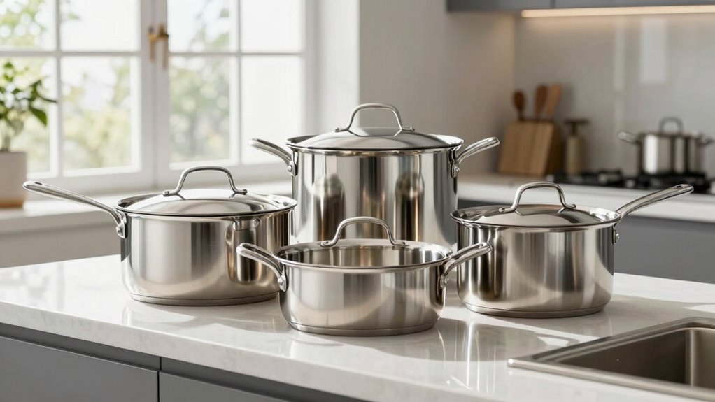 Choosing a high-quality stainless steel cookware set with tri-ply construction starts with understanding the materials used. I look for sets with an aluminum core sandwiched between stainless steel layers because this guarantees superior heat conduction and even cooking. Material safety is essential, so I ensure the stainless steel is food-grade and free from PTFE, PFOA, PFAS, lead, and cadmium, which can pose health risks. I also prefer cookware with full tri-ply construction, as it resists warping, hot spots, and offers durability for daily use. Additionally, a non-reactive surface preserves food flavors and prevents discoloration. Finally, I check for safety certifications like NSF, which confirm the cookware meets strict safety standards and is safe for various cooking conditions.