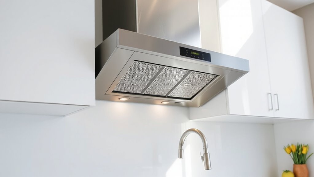 Ease of filter maintenance is a crucial factor to take into account because it directly impacts how often and how easily you can keep your range hood functioning at its best. I look for filters that are dishwasher-safe stainless steel baffles, which simplify cleaning and cut down on maintenance time. Removable filters make it easy to clean thoroughly without needing special tools, ensuring consistent performance. Durable, rust-resistant grease traps and filters resist buildup and extend the lifespan of the hood. Clear indicator systems or accessible filter compartments help me monitor when cleaning or replacing is needed. Additionally, models with fewer filter components or integrated self-cleaning features can streamline routine upkeep, saving time and effort. Choosing a hood with these features means less hassle and more reliable performance.