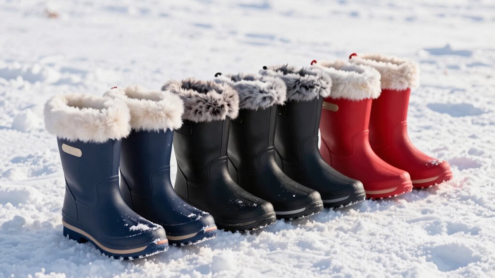 The insulation in waterproof snow boots plays a crucial role in keeping your feet warm and comfortable during cold weather. The effectiveness depends on the type and amount of insulation, like 3M Thinsulate or Thermolite, which offer excellent warmth without bulk. Thicker insulation, indicated by higher grams such as 400g, provides better warmth for extreme cold. The quality and density of lining materials like faux fur or fleece also help trap warm air close to your foot, boosting thermal retention. Additionally, a proper fit and design—such as a snug ankle or calf-high coverage—limit cold air infiltration and keep heat inside. When choosing boots, aim for a combination of high-quality insulation and waterproof construction to ensure your feet stay warm and dry in winter conditions.