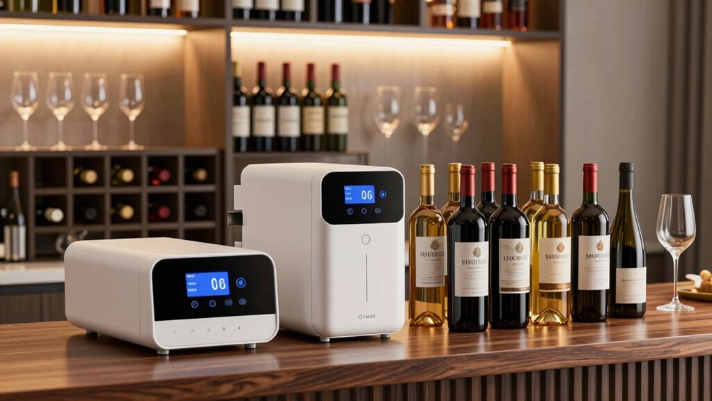Think of preservation systems as a gentle gatekeeper for your wine’s soul. They influence aeration and aroma differently: vacuum seals limit oxygen, preserving delicate flavors but may suppress some aroma release; inert gas systems create a protective blanket, maintaining both aroma and freshness; and temperature-controlled systems actively manage wine environment. Each impacts the wine’s expression uniquely, so choosing depends on whether you want to preserve, enhance, or balance your wine’s character.