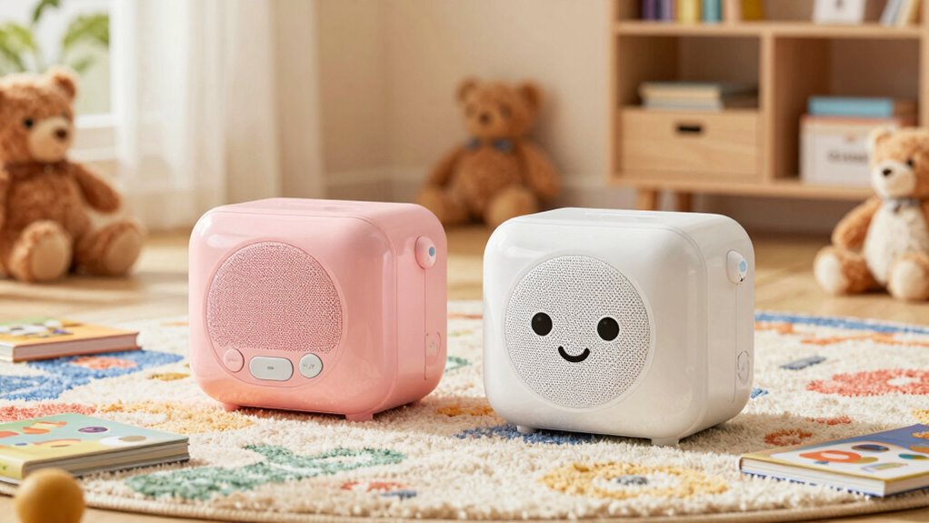 Parental control features are essential to guarantee kids enjoy their devices safely and parents can manage their screen time effectively. Yoto devices include content filtering, usage monitoring, and remote management through a free app, giving parents control over what children listen to and how often. Toniebox offers parental controls via the Tonies app, allowing oversight of playtime, content management, and sleep timers. Unlike some devices, Yoto doesn’t have cameras or microphones, which adds an extra layer of safety. Toniebox combines a simple physical interface with app-based controls for added oversight. Both platforms focus on child safety by providing ad-free, curated content and remote control options, but the specific features and ease of use can differ. Choosing the right one depends on your preference for control and safety features.